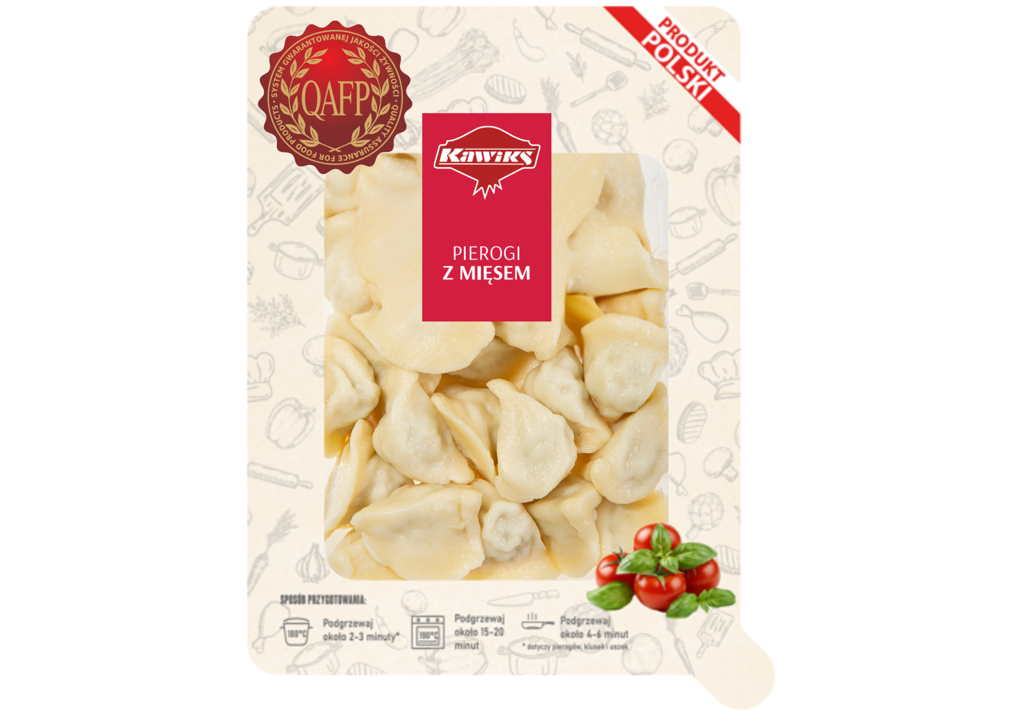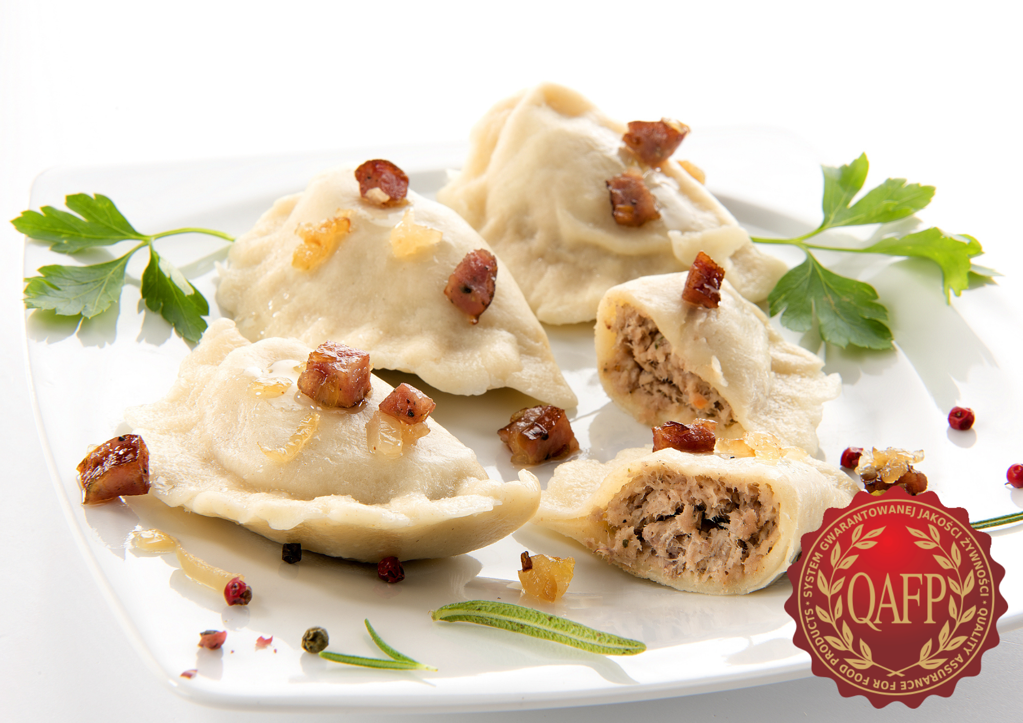 Cienkie ciasto pierogowe wypełnione dużą ilością nadzienia mięsnego. Farsz z mięsa wieprzowego i warzyw zmielony na delikatną, puszystą masę. Produkt oznaczony certyfikatem najwyższej jakości QAFP.